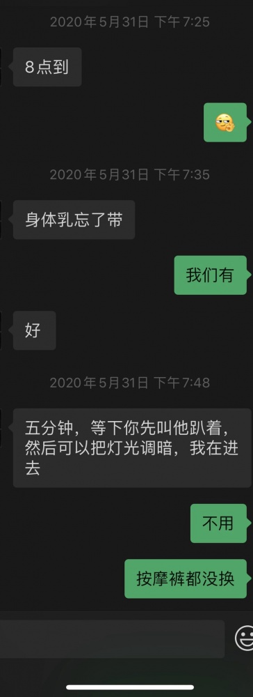 真的是忐忑的一天 计划了一个多月的活动今天终于如约而至的到来 (当然我们也不是第一次找这位技师小哥了,上个月找过他给老婆全身推过油 ),原先定好的计划小哥跟我说请不到假我还以为泡汤了,没想到最后请到假了,直接坐高铁赶来,下面直接上聊天记录吧