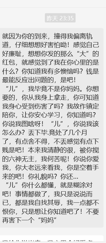 岳母发来一大段话:就因为你的到来,撞得我偏离轨道,仔细想想好害怕呦!感觉自己好廉耻,想想你发的那么“大”的红包,就感觉到了我在你心里的是什么?你知道我有多懊恼吗?钱是最能反应出问题的,是吧!“儿”,我毕竟不是你妈妈。你想要的,你从我身上拿走,你可知道我身心受到伤害了吗?我故作镇定陪你,让你安心学习,你知道吗?你说我图啥呀!“儿”,你说我该怎么办?丟下毕.竟处了几个月了,有点舍不得,不丟感觉有点下贱是吧!本来我清静的很,被你搅的六神无主,我何苦呢!你说你爱我,你大老远来看我,你是空着手来的吧!你礼貌吗?你还…